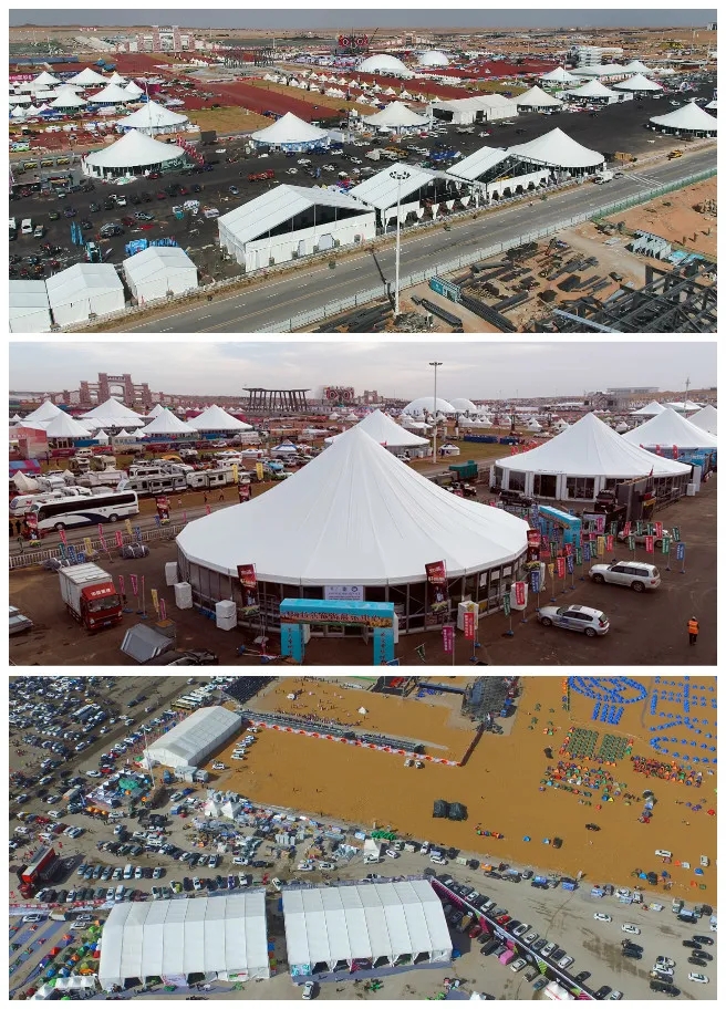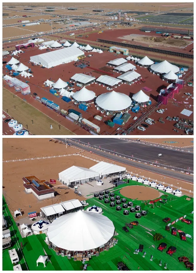高山篷房在沙漠上一個月時間建筑一座城,各種人字,多邊形,球形,四角亭等篷房共計2萬多平方,燈光,地板,玻璃門,墻體等配套是最全與要求最高一次,從生產,配套,安裝等方面出色完成了任務,得到阿拉善盟與組委會贊賞,從2015年開始連續合作6年,看重高山公司整體實力與彼此相信力量,英雄大會有幸,因高山篷房而增色不少。